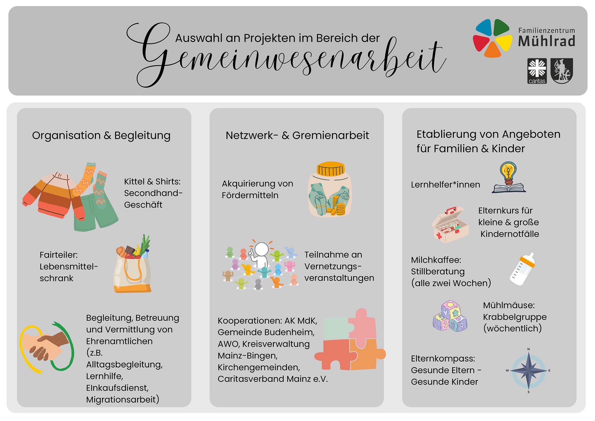 Über die Unterstützung durch das Mühlrad hinaus können wir auf alle Ressourcen des Caritasverbandes zurückgreifen. Zudem verfügen wir über ein Netzwerk mannigfaltiger Unterstützungs- und Hilfsangebote im Kreis Mainz-Bingen. Wir arbeiten auch eng mit dem Arbeitskreis Miteinander der Kulturen zusammen.